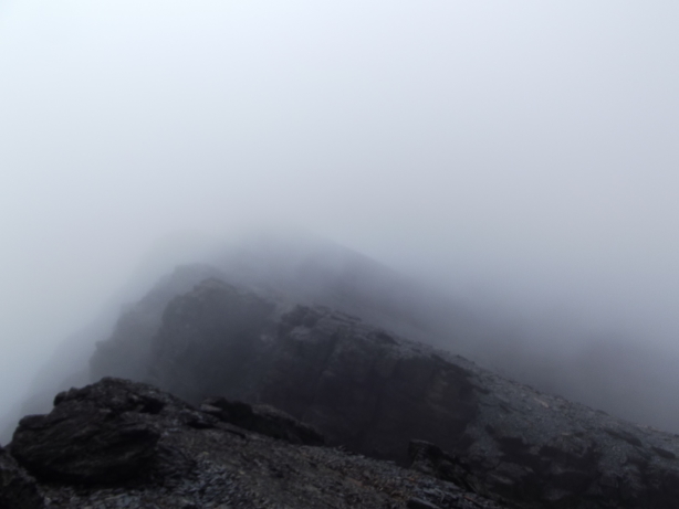 Ich lege ein Stück Brot an die Stelle. Der Nebel lichtet sich noch nicht. Wind kommt auf über dem Pass. Einsamkeit, schwere Schritte.